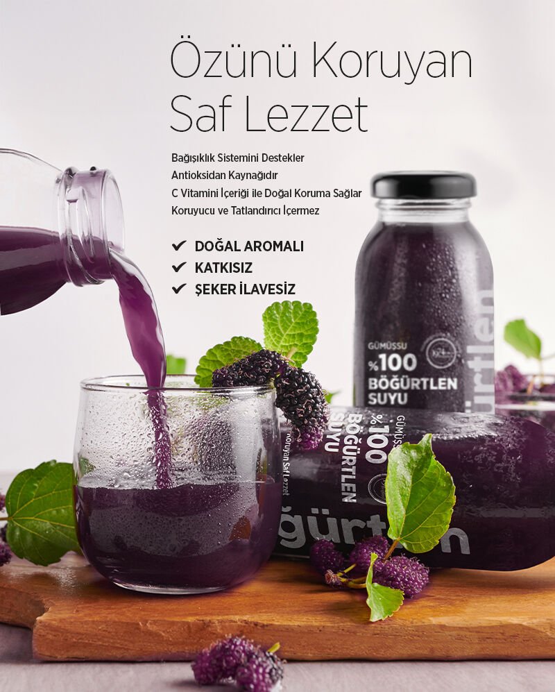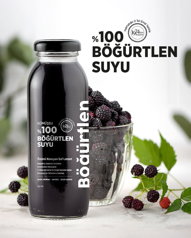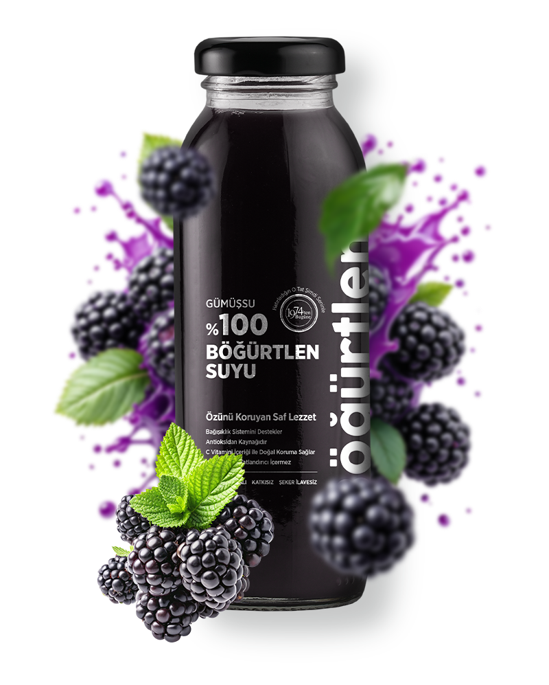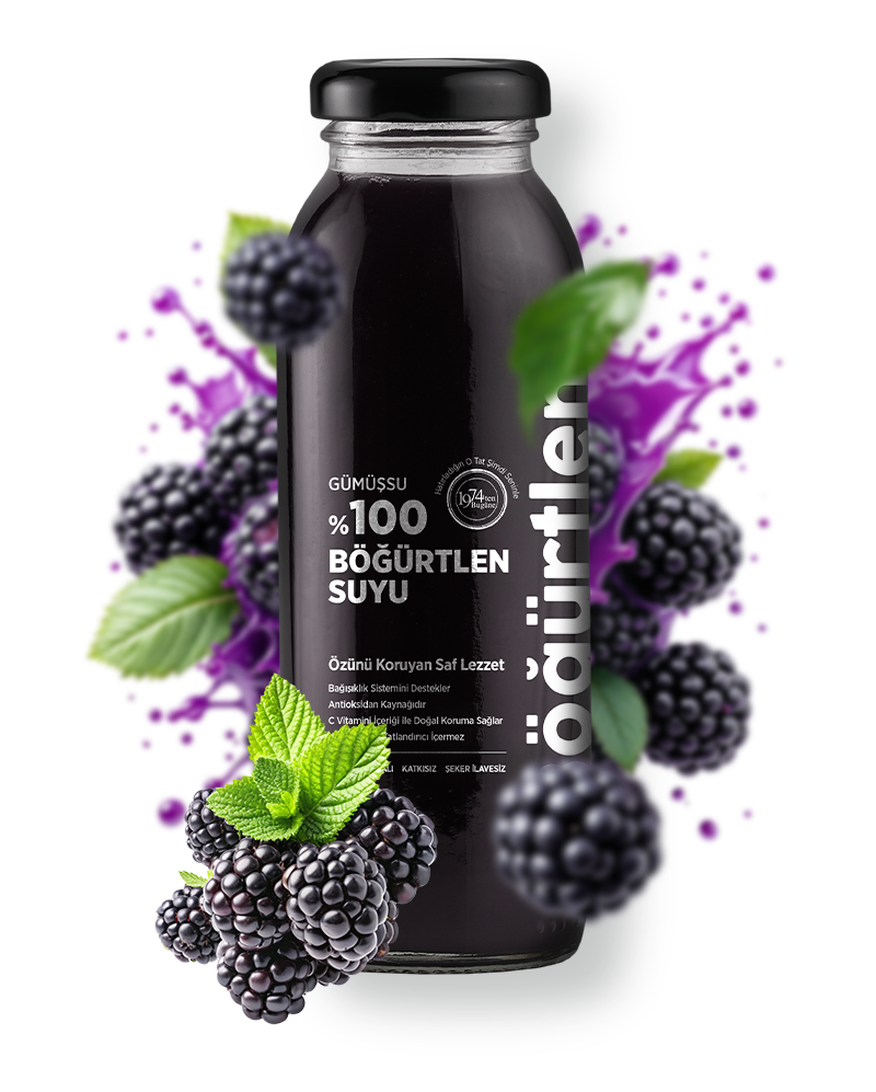 Doğanın en yoğun renklerinden biriyle tanınan böğürtlen, Gümüşsu’nun özenli üretim süreciyle 250 ml’lik şişesinde saf bir içim deneyimine dönüşüyor. Mevsiminde toplanan taze böğürtlenler, hiçbir katkı maddesi, koruyucu ya da ilave şeker kullanılmadan sıkılır. Her yudumda meyvenin kendine özgü aroması, yoğun rengi ve doğal ekşiliği hissedilir.