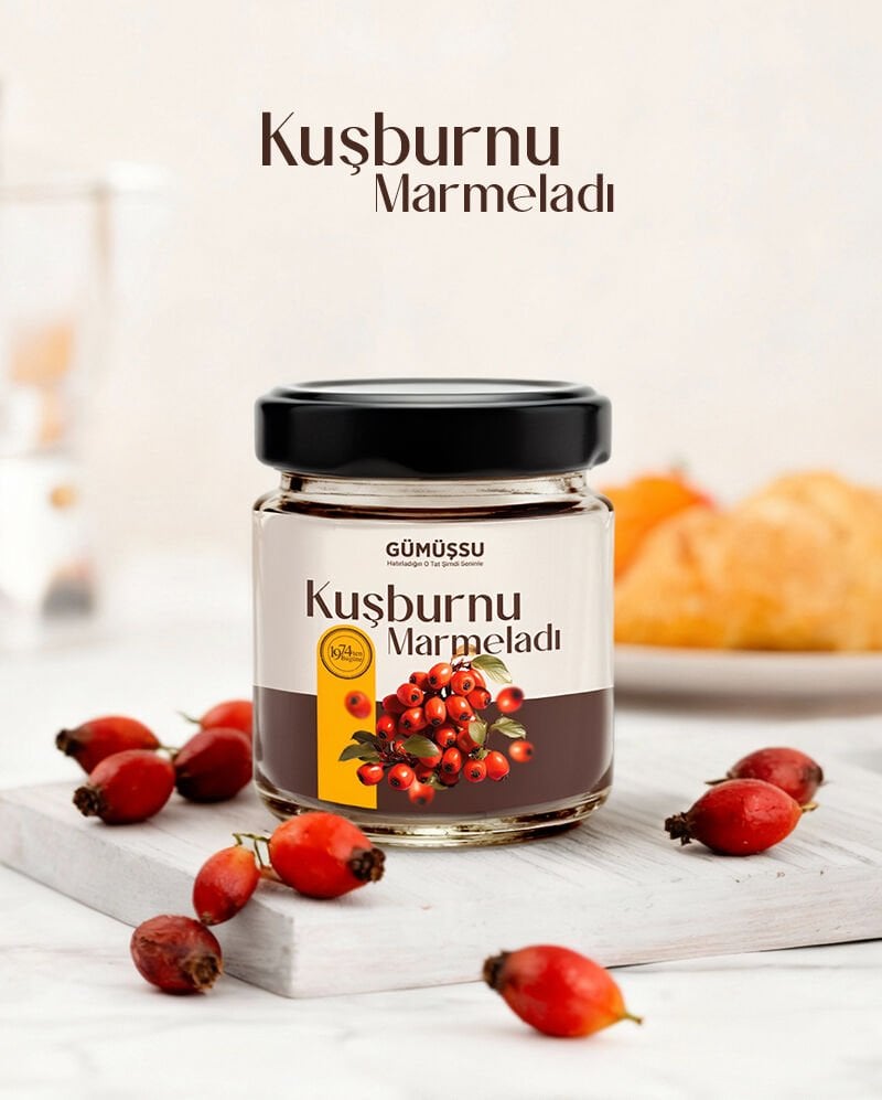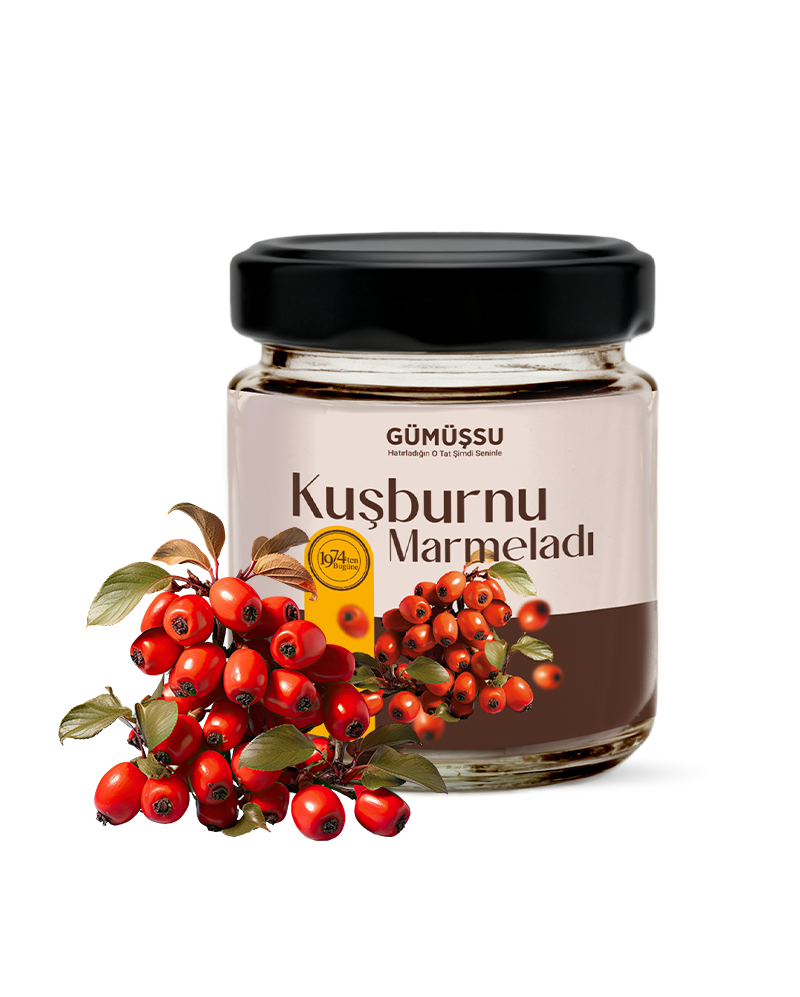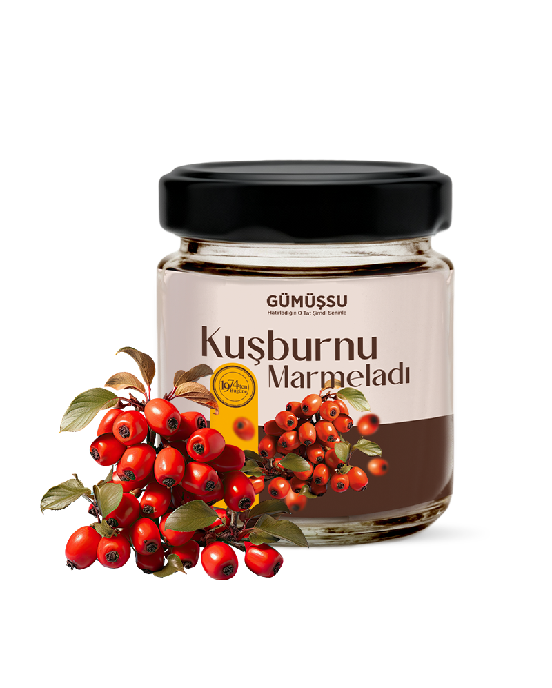 Doğanın en güçlü meyvelerinden biri olan kuşburnu, Gümüşsu’nun ustalığıyla sofralara benzersiz bir lezzet olarak taşınıyor. Vitamin bakımından zengin yapısı ve karakteristik aromasıyla öne çıkan kuşburnu, mevsiminde özenle toplanır ve geleneksel yöntemlerle, hiçbir katkı maddesi kullanılmadan hazırlanır. Her kavanoz, doğanın saf rengini, meyvenin özgün kıvamını ve taze aromasını korur.